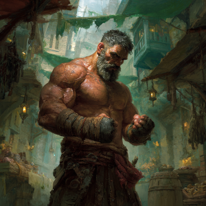A square block of muscle wrapped in prayer beads. His hands are stained with ink and blood. He moves with a terrifying, silent efficiency.