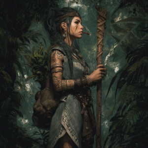 Clad in a tunic of vicuña wool patterned with geometric Tokapu designs, this woman chews on a pouch of leaves. A massive condor circles protectively above her. She carries a staff of knotted wood and copper.