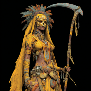 This priestess wears a suit of yellow-dyed leather that is horrifyingly seamless—a ceremonial flayed skin. A golden mask hides her face, and the air around her smells of copper and rot.